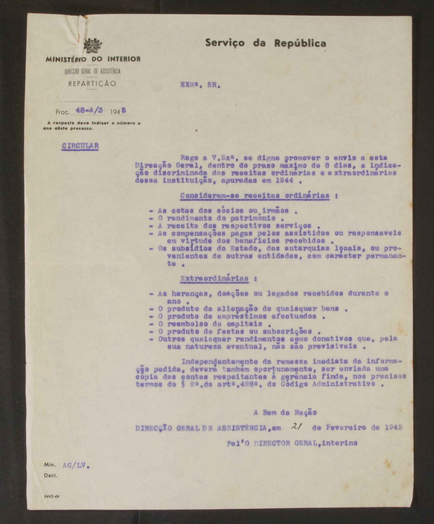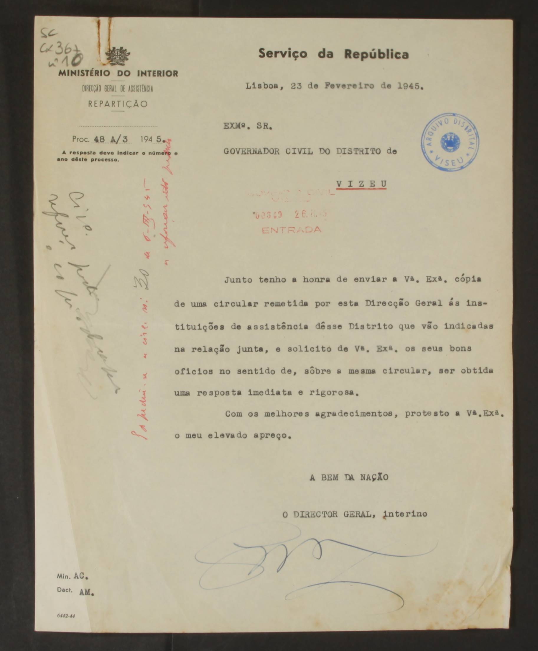 Era da competência do Ministério do Interior dirigir a política de assistência, orientar, tutelar e inspecionar os organismos, instituições ou serviços que prestavam assistência social aos cidadãos portugueses em 1945. Competia, ainda à Direção Geral de Assistência, através dos Governos Civis, a fiscalização dos rendimentos ou subsídios destinados à assistência sem prejuízo da legitima autonomia das instituições.