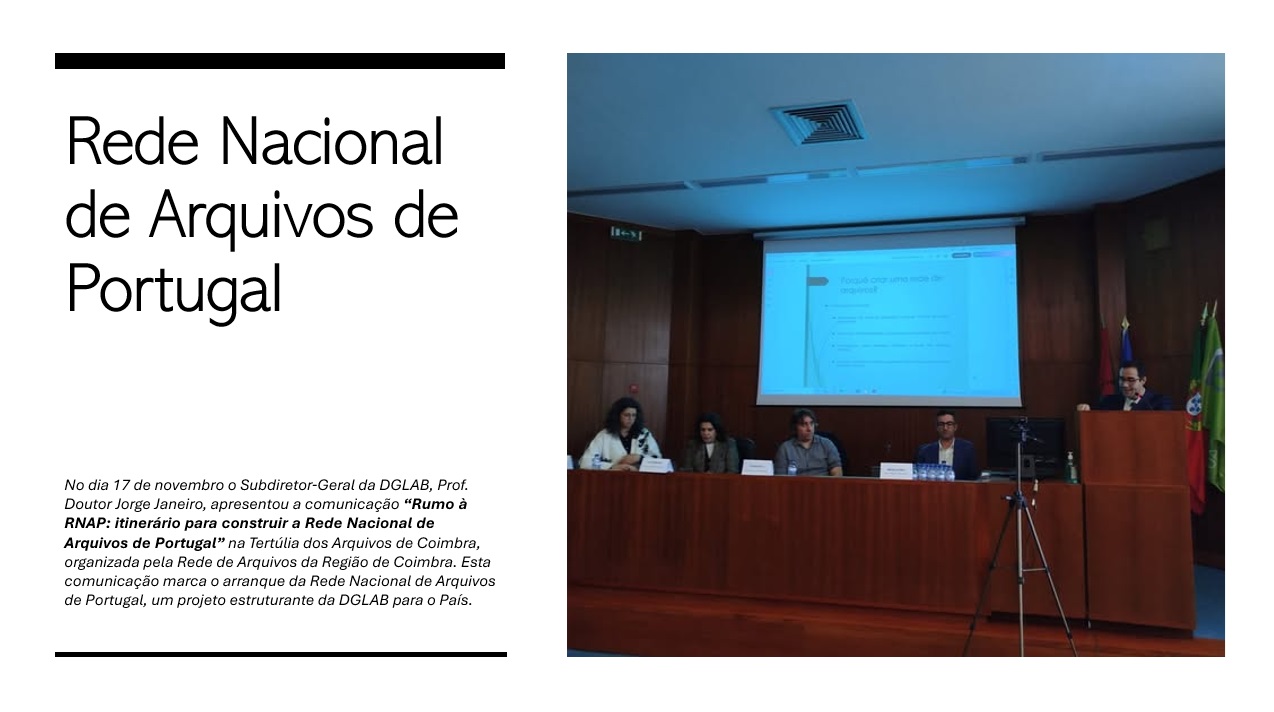 No passado 17 de novembro, o Subdiretor-Geral da DGLAB, Prof. Doutor Jorge Janeiro, apresentou a comunicação “Rumo à RNAP: itinerário para construir a Rede Nacional de Arquivos de Portugal” na Tertúlia dos Arquivos de Coimbra, organizada pela Rede de Arquivos da Região de Coimbra.
