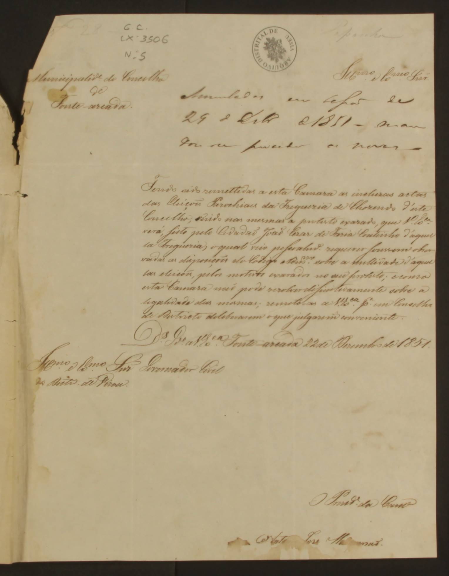 Foi há 174 anos… Que o Presidente da Câmara de Fonte Arcada enviou um ofício ao Governador Civil do Distrito de Viseu . O documento, datado de datado 22 de dezembro de 1851, solicitava que o Conselho de Distrito analisasse o protesto de João César de Faria Coutinho, ocorrido nas eleições paroquiais da freguesia de Chosendo.